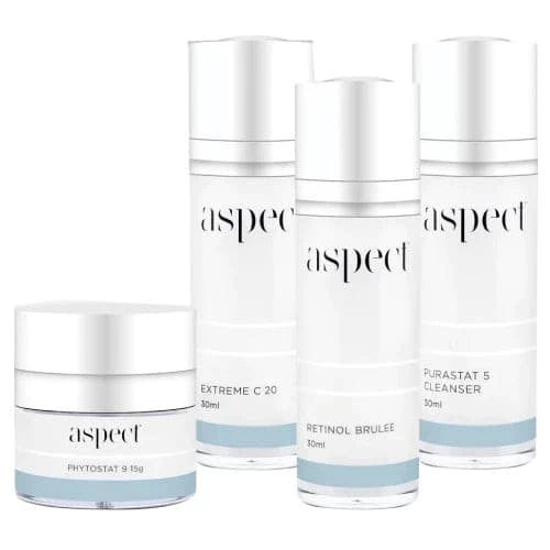 The Aspect Age Management Kit is the ideal choice for clients focused on protecting their skin from the effects of ageing. With a carefully chosen collection of Aspect’s age-defying products, this kit visibly slows the signs of age, such as wrinkles, loss of firmness, and dark spots. Purastat 5 Cleanser cleans and exfoliates without disturbing the skin’s delicate balance, while Extreme C 20 Vitamin C serum works to combat oxidative damage. Retinol Brulee Vitamin A serum resurfaces and softens wrinkles, and Phytostat 9, Aspect’s top-selling moisturiser, seals in hydration.