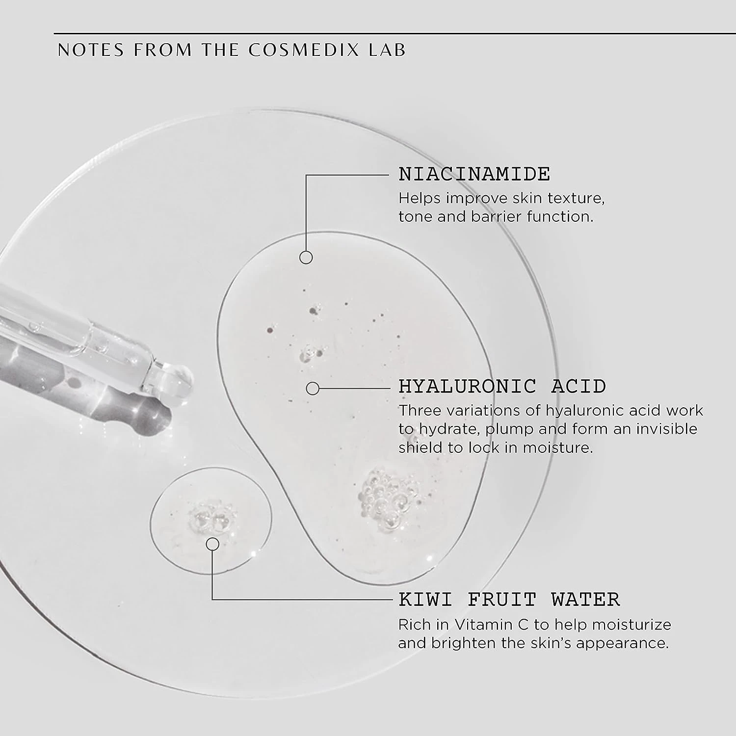 Give your daily skincare routine a surge of hydration! This ultra-dewy Hyaluronic Acid Booster deeply moisturizes dry, dehydrated skin with a specialized blend of three forms of hyaluronic acid (1.5%), niacinamide and kiwi fruit water.