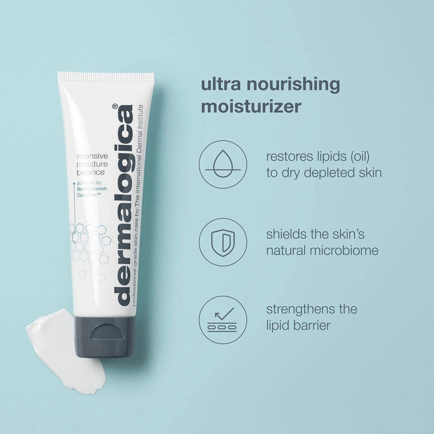 Dermalogica Intensive Moisture Balance is a lipid-restoring moisturiser designed to restore balance to dry, depleted skin. The BioReplenish Complex contains a distinct blend of protective lipids to improve skin resilience and strengthen the barrier. Chlorella Algae works to balance the skin’s microbiome for a more healthy look. Hyaluronic Acid, Echinacea, Centella Asiatica and Aloe Vera combine to lock in moisture, reducing the visibility of wrinkles.
