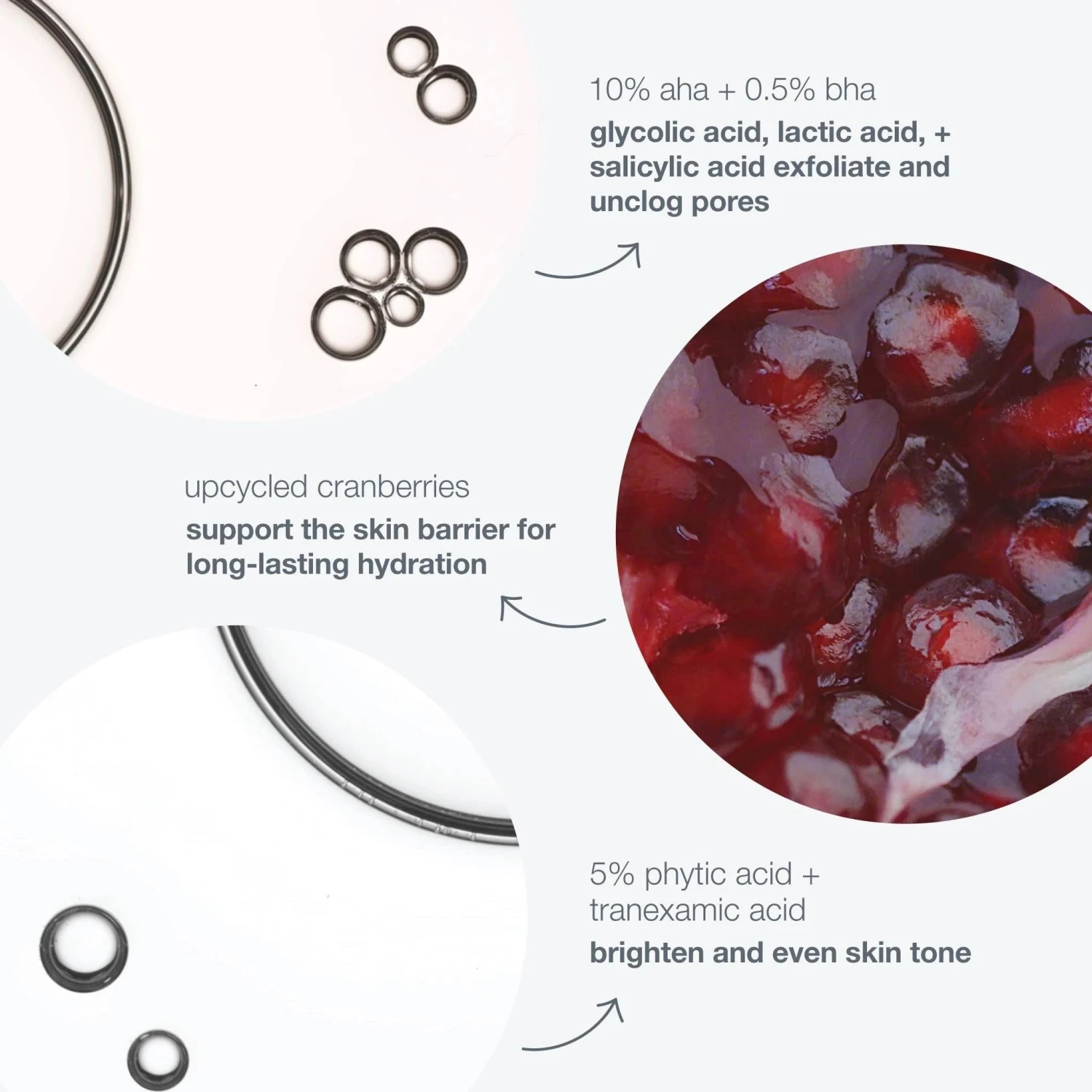 A scientifically-formulated, professional-grade at-home peel containing 30% acids and enzymes (Glycolic, Lactic, Salicylic, Phytic, Tranexamic acids plus Gluconolactone and fermented Pomegranate Enzyme) takes action at different levels, exfoliating, unclogging pores and producing a more even, luminous complexion. Lipid-rich upcycled Cranberry Extract ensures lasting moisture.